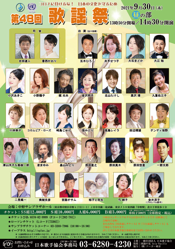 開催日:2021年09月30日 昼の部 開場 9時50分/ 開演10時30分 出演者 原田悠里・北山たけし・大江裕 他 チケット(全席指定) SS席 12,000円 S席 10,000円 A席 6,000円 B席 3,000円 お問合せ・お問合せ 日本歌手協会事務局 03−6280−4230