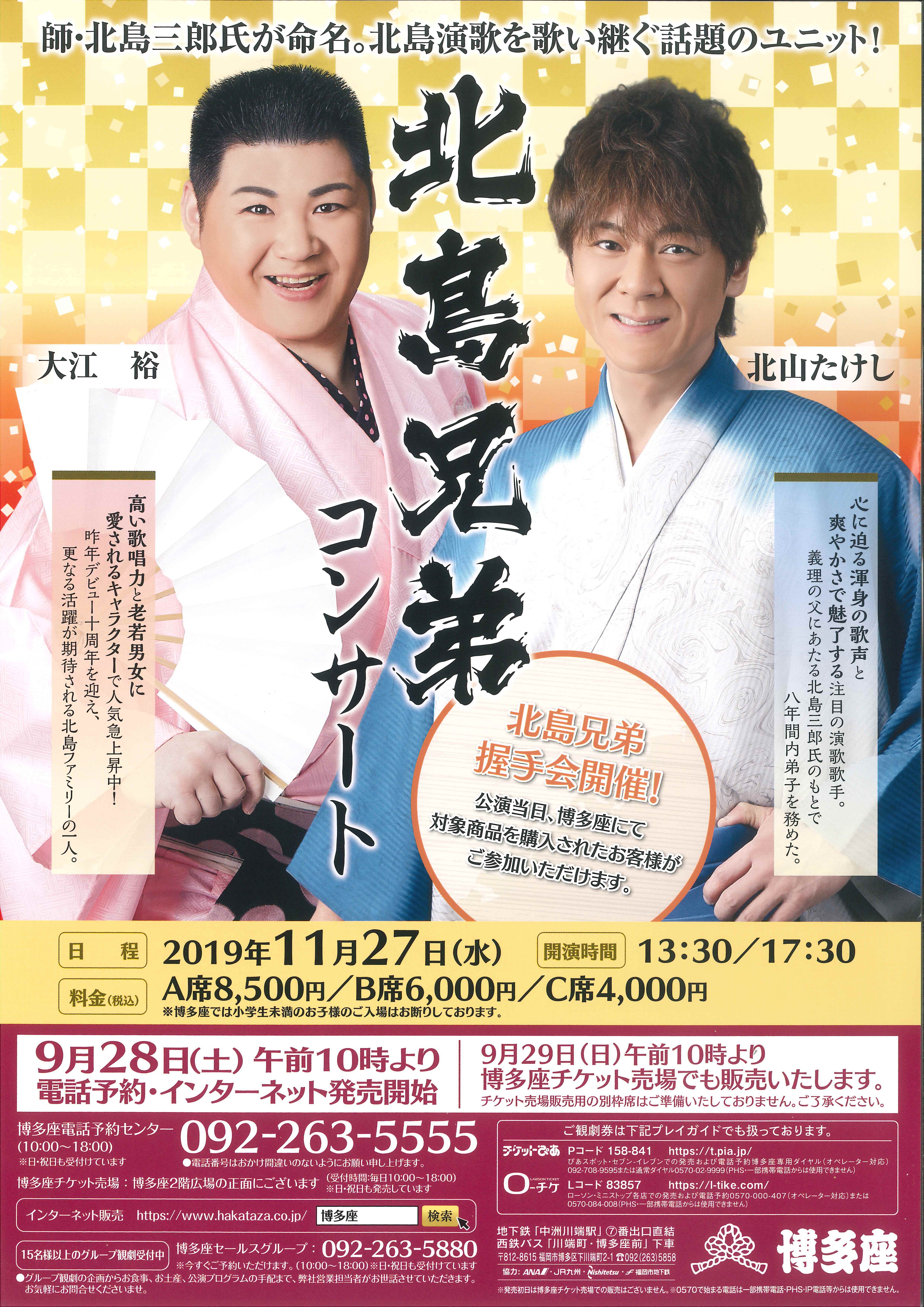 会場名:博多座 住所:福岡県福岡市博多区下川端町2−1 URL:https://www.hakataza.co.jp/lineup/201911/kitajimabrother/index.php
